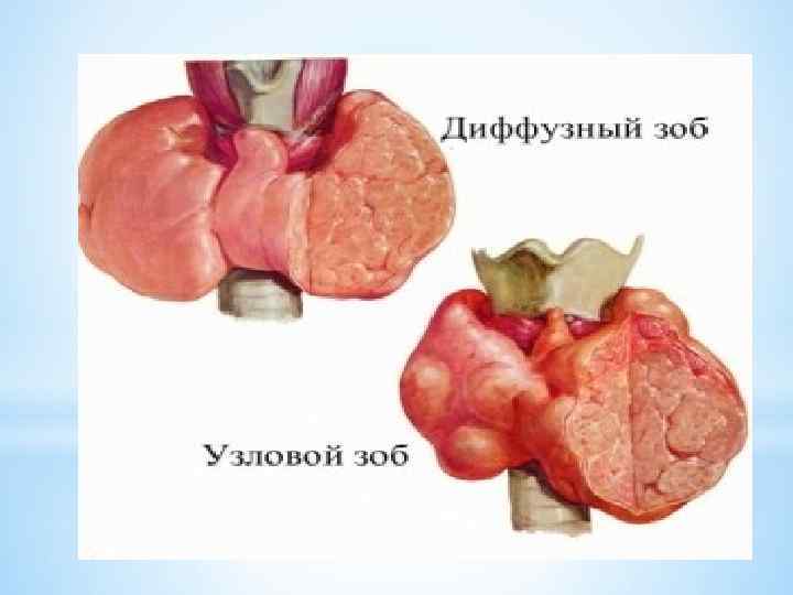 * узловой зоб с единственным увеличенным узлом; узловой зоб с множественным и увеличенными узлами; зоб, при котором множественные узлы объединены друг с другом; узловой зоб, вызванный дефицитным состоянием йода в организме.
