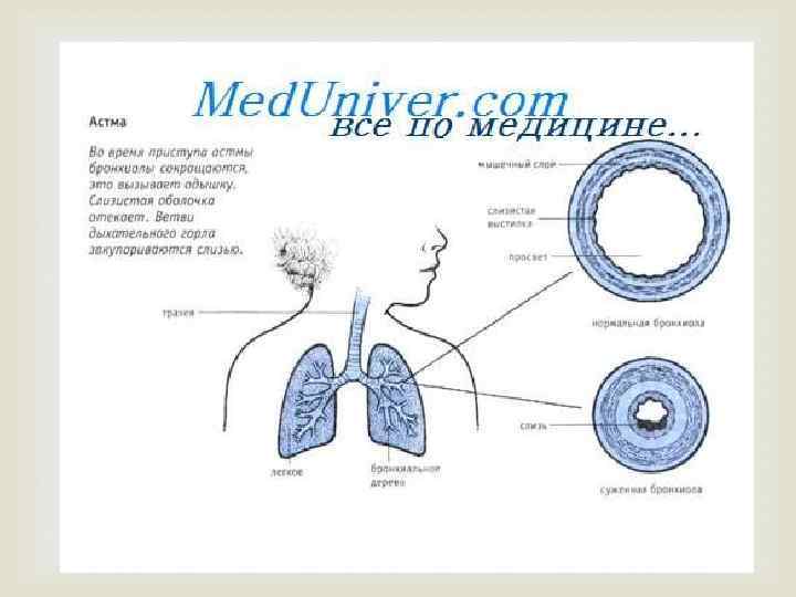 Патогенез Метаболическая форма (медленная) — развивается на фоне обострения бронхиальной астмы. Основные патогенетические факторы: Глубокая блокада β 2 -адренорецепторов, преобладание αадренорецептороов, вызывающих бронхоспазм; Выраженный дефицит глюкокортикоидов, усугубляющий блокаду β 2 -адренорецепторов; Воспалительная обструкция бронхов (инфекционная или аллергическая); Нарушение естественной дренажной функции, подавление кашлевого рефлекса и дыхательного центра; Преобладание холинергических бронхосуживающих влияний; Экспираторный коллапс мелких и средних бронхов (спадание на выдохе).