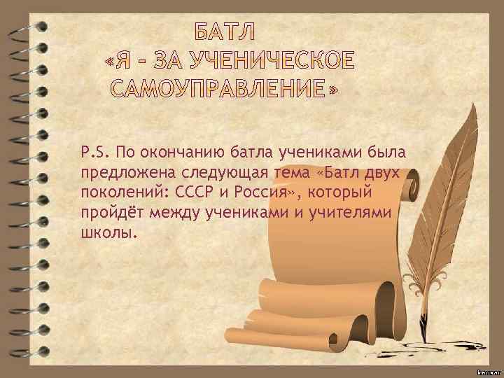 P. S. По окончанию батла учениками была предложена следующая тема «Батл двух поколений: СССР и Россия» , который пройдёт между учениками и учителями школы.