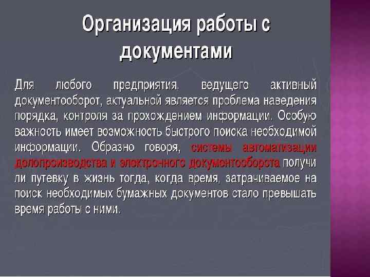 Документооборо т — деятельность по организации движения документов на предприятии с момента их создания или получения до завершения исполнения: отправки из организации и (или) направления в архив. Документооборот – это движение документов в организации с момента их создания или получения до завершения исполнения или отправки.