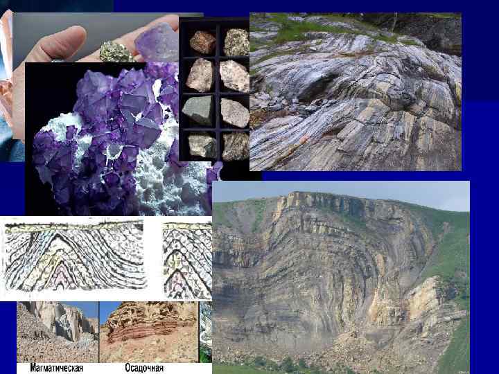 Науки о земной коре n Минералогия — раздел геологии, изучающий минералы, вопросы их генезиса, квалификации. n Петрология (Петрография) — раздел геологии, изучающий магматические, метаморфические и осадочные горные породы — их описание, происхождение, состав, текстурно-структурные особенности, а также классификацию. Многолетнемёрзлые горные породы приобретают ряд характерных свойств и особенностей, изучением которых занимается геокриология. n Литология (Петрография осадочных пород) — раздел геологии, изучающий осадочные породы. n Структурная геология — раздел геологии, изучающий формы залегания геологических тел и нарушения земной коры. n Кристаллография — первоначально одно из направлений минералогии, в настоящее время скорее физическая дисциплина.