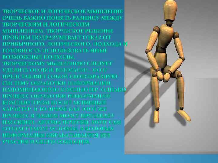 Подготовка Стадия подготовки соответствует этапу планирования какого либо проекта и включает в себя определение проблемы, сбор данных и принятие основных допущений. Задайте сами себе вопрос: «Чего именно я хотел бы добиться? » Суть «проблемы» общения, так же как и любой другой, заключается в преодолении разрыва между вашим нынешним и желаемым состоянием (при помощи обмена информацией, убеждения, получения ответов на вопросы и т. п. ) Анализ На этой стадии следует заглянуть в глубь проблемы, учесть все плюсы, взвесить все «за» и «против» К сожалению, довольно часто решение проблемы сводят к анализу ее частей и работе над ними. Аналитическое и творческое мышление Очень важно уметь улавливать моменты, когда аналитического мышления становится уже недостаточно и возникает необходимость подключать творческое мышление.