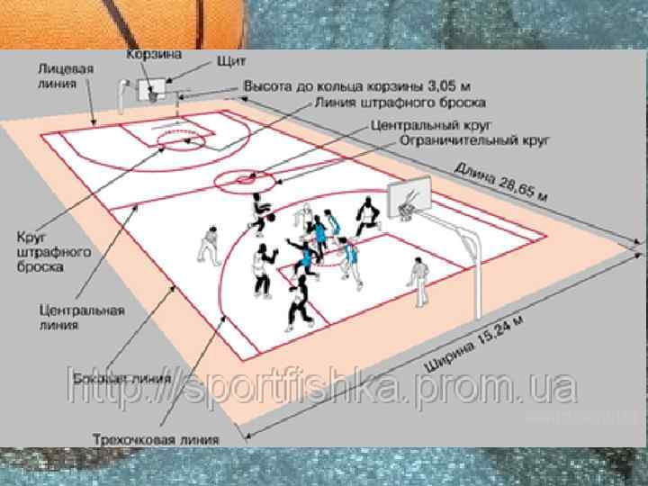 Правила игры Игра проходит на прямоугольной площадке длиной 28 и шириной 15 м специальным мячом. Корзина (металлическое кольцо диаметром 45 см с натянутой на нем сеткой без дна) крепится на высоте 3, 05 м на щите, установленном на стойке параллельно лицевым линиям площадки. Матч начинается в центре площадки. Судья подбрасывает мяч строго вверх между двумя игроками команд-соперниц. В тот момент, когда они касаются мяча (брать мяч в руки нельзя), начинается отсчет игрового времени. После каждого свистка судьи секундомер останавливается – и с возобновлением игры включается вновь. (Соответственно, в баскетболе различают «живой мяч» и «мертвый мяч» . ) Игровое время фиксирует судья-секундометрист.