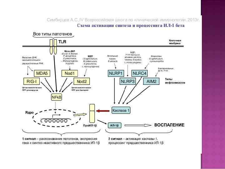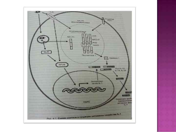 Ø Ø Биологически неактивная молекула предшественника сначала накапливается в цитозоле , а затем перемещается в специализированные лизосомы, где находится неактивная форма IL 1 –конвертазы(каспазы 1) прокаспаза 1. Далее происходит активация прокаспазы 1 с образованием биологически активного фермента под влиянием нескольких цитоплазматический белков , формирующих так называемую инфламосому Прежде всего, это внутриклеточные цитоплазматические белки, распознающие патоген ассоциированные молекулярные паттерны и относящиеся к группе внутриклеточных паттерн распознающих рецепторов, цитоплазматических NOD подобны к рецепторов( NOD like гесерtоrs , NLR, известных также под названием CATERPILLER proteins). В их число входят цитоплазматические белки NОD 1 , иначе называемый также CАRD 4 по своему главному функциональному домену, и NOD 2 (другое название САRD 15), цитоплазматические белки из группы NALP и некоторые другие. В данном случае LRR представляет собой участок взаимодействия с патоген ассоциированными молекулярными паттернами. Внутриклеточные NLR, как мембранные Toll like receptors(TLR) взаимодействуют с молекулярными структурами микроорганизмов, что приводит к активации двух принципиально важных путей внутриклеточного сигналинга: активация транскрипционного фактора NFк. В, его транслокация в ядро и запуск экспрессии генов цитокинов семейства IL-1 и других провоспалительны х цитокинов; активация внутриклеточных белков, входящих в состав инфламмасомы, приводящая к образованию биологически активной каспазы-1.