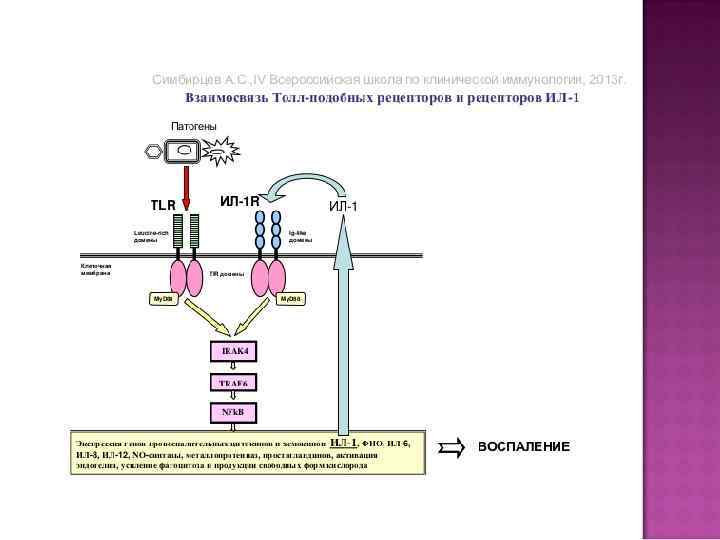 Вслед за взаимодействием TLR со специфическим лигандов, например LPS, запускается программа передачи, внутриклеточного сигнала активации, который полностью повторяется при передаче сигнала от рецептора IL 1, благодаря наличию одинаковых ТIR доменов