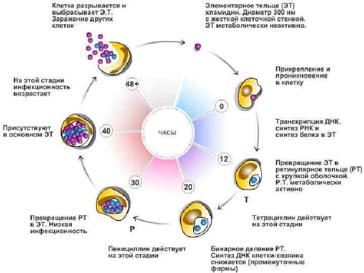 Жизненный цикл развития хламидии представлен двумя клеточными формами - элементарными и ретикулярными тельцами. Элементарные тельца являются высокоинфекционными внеклеточными формами, характеризующимися полиморфизмом, имеющими розовато-фиолетовый оттенок при окраске по Романовскому-Гимзе. В результате проникновения внутрь клетки элементарные тельца превращаются в ретикулярные (репродукционная внутриклеточная форма). Ретикулярное тельце способно к делению и считается вегетативной формой хламидии, окрашивается по Романовскому- Гимзе в голубоватый цвет. В ходе размножения вегетативные формы вновь образуют элементарные тельца, участвующие в заражении неповрежденных клеток. Цикл развития хламидиоза двое суток, но они очень чувствительны к антибиотикам, химиотерапии, к ультрафиолетовым лучам и высокой температуре(при 100°C хламидии умирают через минуту). Более благоприятная для них среда это хлопчатобумажная ткань, там они живут до 2 х суток. Идеальная же среда для хламидиоза при низких температурах, в минус 20 -70°C они живут до 10 месяцев.