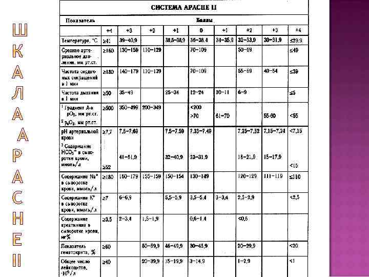 >300 226 -300 101 -200 1 Балл 201 -350 2 Балла 3 Балла 4 Балла 0 баллов 1 Балл 61 -120 2 Балла 3 Балла 4 Балла 0 баллов 10, 1 -15 1 Балл 15, 1 -20, 0 2 Балла 3 Балла 4 Балла >120 0 баллов 81 -120 1 Балл 51 -80 2 Балла 21 -50 3 Балла >20 4 Балла 15 0 баллов 13 -14 Шкала Глазго* 0 баллов >30 Нервная Балла 20, 1 -30 Тромбоциты, * 10 9/л 4 <10 Кровь Балла >240 PAR (PAR=ЧСС x САД/ЦВД) 3 121 -240 CCC 76 -150 21 -60 Билирубин, мкмоль/л Балла <20 Печень 2 >500 Креатинин, мкмоль/л 151 -225 351 -500 Почки Балл <100 PO 2/Fi. O 2 1 <75 Дыхание 0 баллов 1 Балл 10 -12 2 Балла 12 -6 3 Балла <6 4 Балла