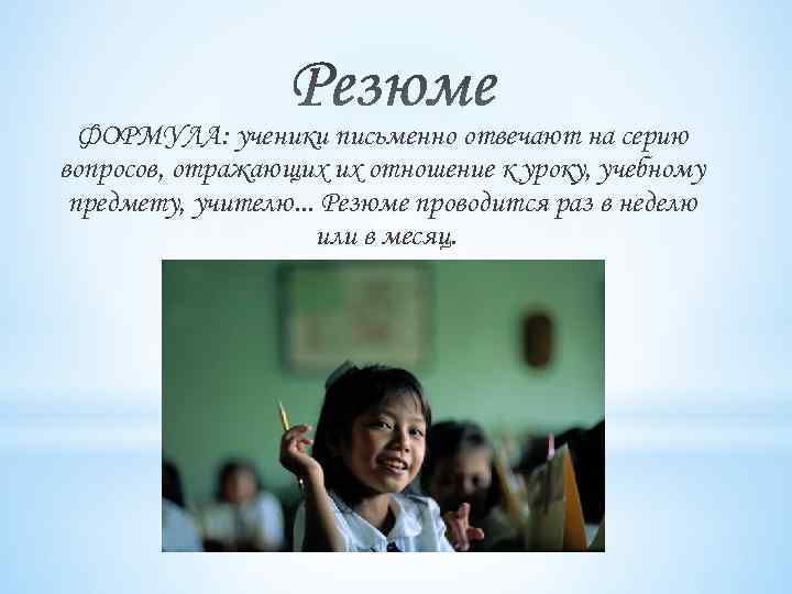 ФОРМУЛА: ученики письменно отвечают на серию вопросов, отражающих их отношение к уроку, учебному предмету, учителю. . . Резюме проводится раз в неделю или в месяц.