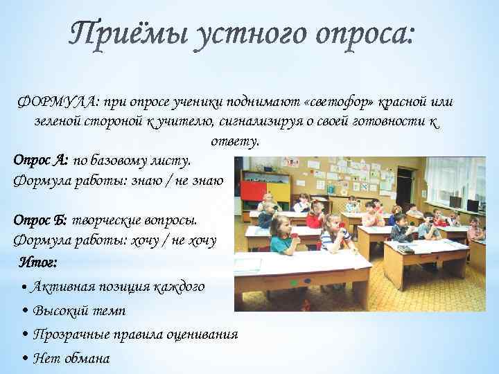 ФОРМУЛА: при опросе ученики поднимают «светофор» красной или зеленой стороной к учителю, сигнализируя о своей готовности к ответу. Опрос А: по базовому листу. Формула работы: знаю / не знаю Опрос Б: творческие вопросы. Формула работы: хочу / не хочу Итог: • Активная позиция каждого • Высокий темп • Прозрачные правила оценивания • Нет обмана