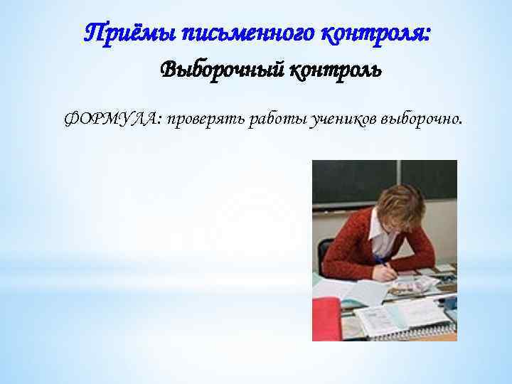 Приёмы письменного контроля: Выборочный контроль ФОРМУЛА: проверять работы учеников выборочно.