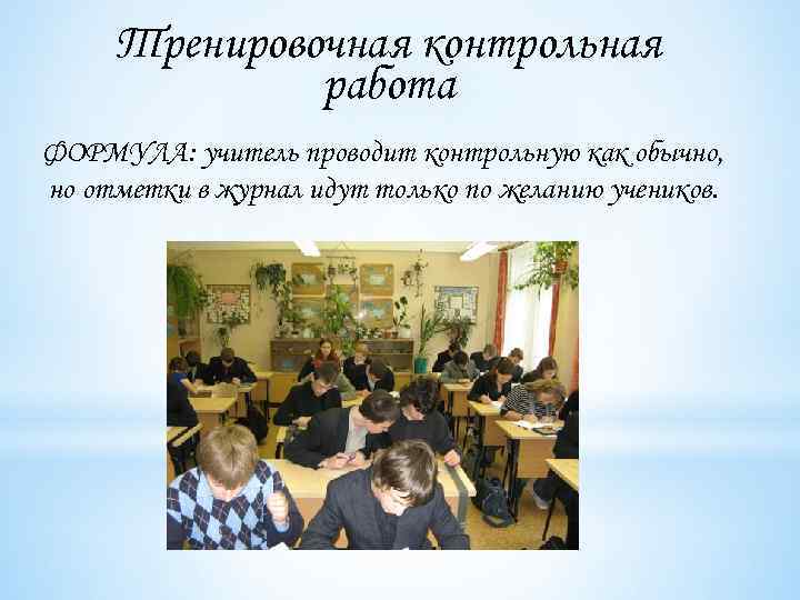 Тренировочная контрольная работа ФОРМУЛА: учитель проводит контрольную как обычно, но отметки в журнал идут только по желанию учеников.