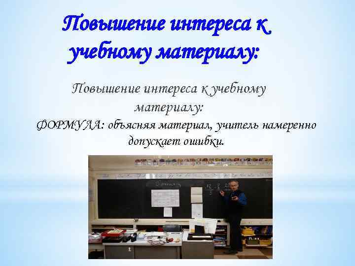 Повышение интереса к учебному материалу: ФОРМУЛА: объясняя материал, учитель намеренно допускает ошибки.