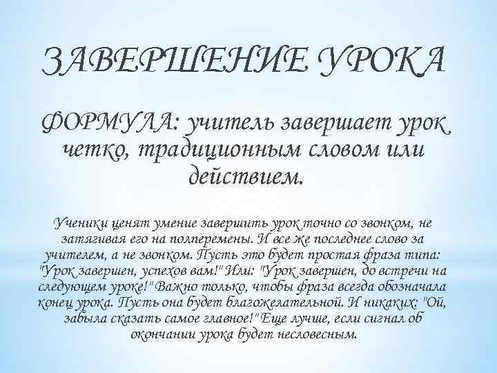 ЗАВЕРШЕНИЕ УРОКА ФОРМУЛА: учитель завершает урок четко, традиционным словом или действием. Ученики ценят умение завершить урок точно со звонком, не затягивая его на полперемены. И все же последнее слово за учителем, а не звонком. Пусть это будет простая фраза типа: "Урок завершен, успехов вам!" Или: "Урок завершен, до встречи на следующем уроке!" Важно только, чтобы фраза всегда обозначала конец урока. Пусть она будет благожелательной. И никаких: "Ой, забыла сказать самое главное!" Еще лучше, если сигнал об окончании урока будет несловесным.