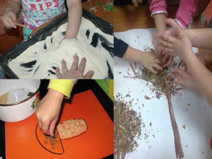 Рисование сухими листьями (сыпучими материалами и продуктами) Сухие листья приносят много радости детям. Подходит детям с выраженной моторной неловкостью, негативизмом, зажатостью, способствует процессу адаптации в новом пространстве, дарит чувство успешности. Гораздо эффективнее, сделать этот процесс арт-терапией и инструментом расслабления.