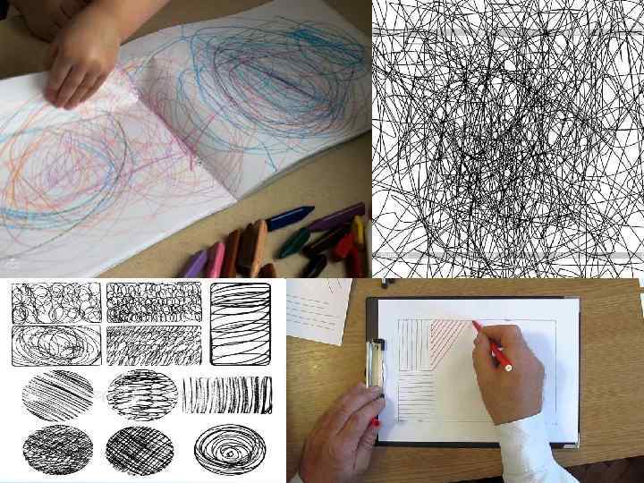 Штриховка, каракули. Штриховка – это графика. Изображение создается без красок, с помощью карандашей и мелков. Штриховки и каракули помогают расшевелить ребенка, дают почувствовать нажим карандаша или мелка, снимают напряжение перед рисованием. Штриховки и марания происходят в определенном ритме, который оказывает благотворное влияние на эмоциональную сферу ребенка. У каждого ребенка он свой, диктуемый психофизиологическими ритмами организма. Ритм создает активность, тонизирует ребенка. настрой на