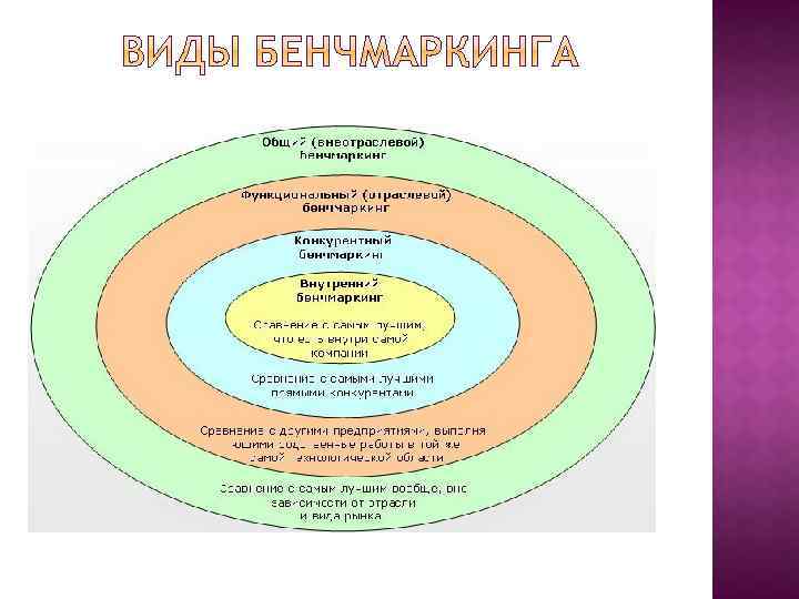 Внутренний «бенчмаркинг» - сопоставление практики и деятельности аналогичных подразделений в рамках одной организации, а также сопоставление практики и деятельности одного и того же подразделения в течение всего периода времени. Конкурентный «бенчмаркинг» - сопоставление практики и деятельности данной компании с практикой и деятельностью ее конкурентов. Отраслевой/функциональный «бенчмаркинг» - оценка места компании в данной отрасли или функциональной области по нескольким отраслям. *Бенчмаркинг бизнес-процессов возможен в ситуации, когда компания, действующая в одной отрасли, может сопоставить себя с компанией, действующей в другой отрасли, однако по одному и тому же типу процесса.