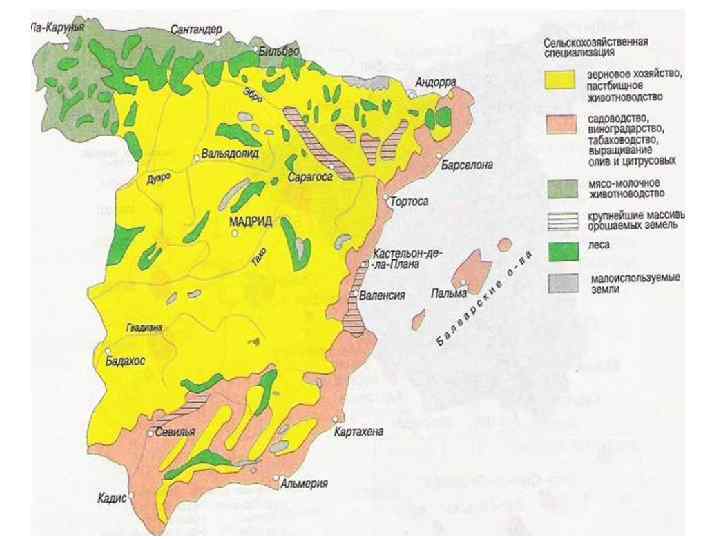 Почвенно-климатическое разнообразие различных регионов Испании обуславливает специализацию автономных областей: • В Андалусии, Мурсии, на Канарских и Балеарских островах ив Валенсиидоминирует садоводство; Андалусиятакже имеет 80% оливковых деревьев и производит более 90% испанского хлопка. • Кастилия– Ла-Манча и Риоха имеют важное значение с точки зрения виноградников и зерновых. • Кастилия и Леон специализируется на зерновых и технических культур (подсолнечник и свекла). • Сельскохозяйственное производство в Наварре и Эстремадуре известно зерновыми и фруктами.