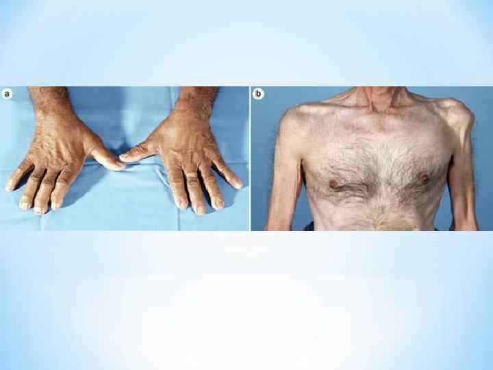 * Для БАС в большинстве случаев характерна асимметричность * симптоматики. * В атрофированных обнаруживаются фасцикуляции(локальные или распространенные) * В типичном случае начало заболевания с похудания мышц тенара одной из кистей с развитием слабости аддукции (приведения) и оппозиции большого пальца, (обычно асимметрично), что затрудняет схватывание большим и указательным пальцами и приводит к нарушениям тонкого моторного контроля в мышцах кисти. Больной ощущает затруднения при подбирании мелких предметов, при застегивании пуговиц, при письме. * Затем, в процесс вовлекаются мышцы предплечья, а кисть приобретает вид «когтистой лапы» . Через несколько месяцев развивается сходное поражение другой руки. Атрофия, постепенно распространяясь, захватывает мышцы плеча и плечевого пояса. * Одновременно с этим или позже часто развивается поражение бульбарных мышц: фасцикуляции и атрофия языка, парез мягкого неба, атрофия мышц гортани и глотки, что проявляется в виде дизартрии (нарушения речи), дисфагии (нарушения глотания), слюнотечения. Мимические и жевательные мышцы обычно поражаются позже других групп мышц. По мере развития заболевания становится невозможным высовывание языка, надувание щек, вытягивание губ в трубочку. Иногда развивается слабость разгибателей головы, из за чего больной не может держать голову прямо. При вовлечении в процесс диафрагмы наблюдается парадоксальное дыхание (на вдохе живот западает, на выдохе выпячивается).