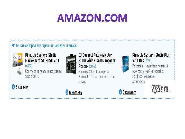 Действенность разного вида рекомендаций: (опыт ОЗОНа) На просмотре карточки товара: • С этим товаром часто покупают (9% всех добавлений в корзину) • Те, кто смотрел эту страницу, затем купили (5% всех добавлений в корзину) На просмотре результатов поиска: • Те, кто искал «кейворд» , купили: (5% всех добавлений в корзину) Про просмотре раздела: • Бестселлеры просматриваемого раздела (4% всех добавлений в корзину) Рекомендательная система - это 38% количества товаров, добавленных в корзину.