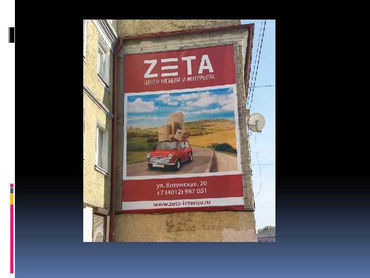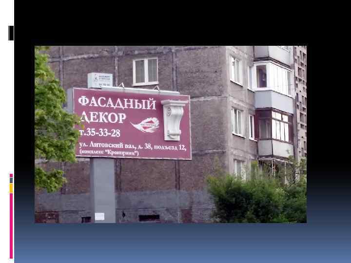 Место: Литовский вал Конструкция: статичная; Носитель: билборд Шрифт: понятный, легко читаемый, на красном фоне выделяется. v Цвета: хорошо сочетаются; v Удачная или неудачная: удачная; v рекламное содержание понятное, интересное, оригинальное. Содержание не переполнено, все кратко и ясно. Имеются контактные данные; v Оценка эффективности рекламного обращения : 8