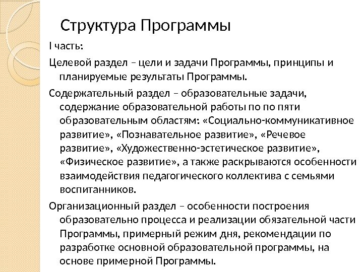 Структура Программы I часть: Целевой раздел – цели и задачи Программы, принципы и планируемые результаты Программы. Содержательный раздел – образовательные задачи, содержание образовательной работы по по пяти образовательным областям: «Социально-коммуникативное развитие» , «Познавательное развитие» , «Речевое развитие» , «Художественно-эстетическое развитие» , «Физическое развитие» , а также раскрываются особенности взаимодействия педагогического коллектива с семьями воспитанников. Организационный раздел – особенности построения образовательно процесса и реализации обязательной части Программы, примерный режим дня, рекомендации по разработке основной образовательной программы, на основе примерной Программы.