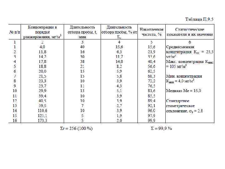 1. Операции технологического процесса, их длительность, длительность отбора каждой пробы и соответствующие им концентрации вносят в табл. П. 9. 1: 2. Результаты измерений концентраций вещества в порядке возрастания вносят в графу 2 табл. П. 9. 2, а в графе 3 отмечают соответствующую ей длительность отбора пробы. Время отбора всех проб суммируется и принимается за 100 %.