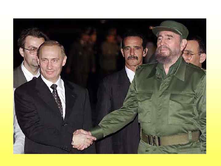 Новый этап в отношениях между Россией и Кубой открыл официальный визит на Остров Свободы президента Российской Федерации В. В. Путина, состоявшийся 13 -16 декабря 2000 г. “Нам нужно ясно и точно понять, что является перспективным в наших отношениях, что можно считать проблемами вчерашнего дня. Нужно выбрать наиболее эффективные и интересные точки соприкосновения и не только наиболее интересные конкретные проекты, но и направления двустороннего сотрудничества. ”