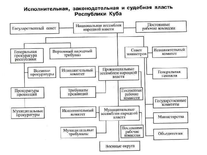 Высшим органом исполнительной власти является Совет Министров. Председатель Государственного совета и Совета Министров является главой государства. В административном отношении Куба подразделяется на 14 провинций, которые в свою очередь делятся на 169 муниципий, одна из которых — Хувентуд — центрального подчинения. На Кубе популярен лозунг: “Власть народа – это действительно власть! ”. Высшая руководящая сила кубинского общества и государства – Коммунистическая Партия Кубы.