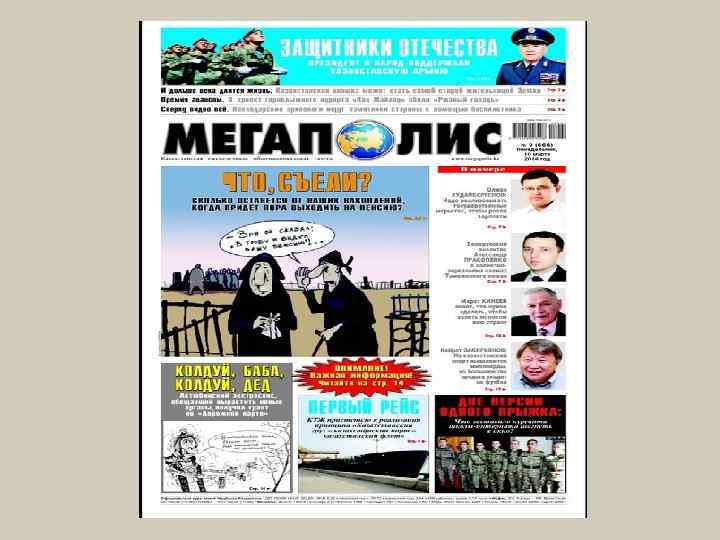 ВЫВОД v Что почитать? v * Самые свежие новости от собственных корреспондентов со всех городов Казахстана. v * Политические и экономические рубрики, усиленные аналитикой от ведущих экспертов республики. v * Самые неудобные вопросы чиновникам всех рангов и комментарии к их ответам. v * В рубрике «Народный контроль» мы задаемся самыми неожиданными вопросами и слушаем мнения наших читателей. v * Хроника чрезвычайных происшествий республики в рубрике «Оперативный центр» . v * Мистическая 20 -я полоса и сплетни о звездах мирового шоу-бизнеса.