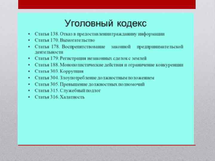 Коррупция –умышленное использование государственным должностным или приравненным к нему лицом своего служебного положения и связанных с ним возможностей, сопряженное с противоправным получением имущества или другой выгоды в виде услуги, покровительства, обещания преимущества для себя или для третьих лиц, с тем, чтобы это государственное должностное или приравненное к нему лицо совершили действия или воздержались от их совершения при исполнении своих служебных (трудовых) обязанностей.