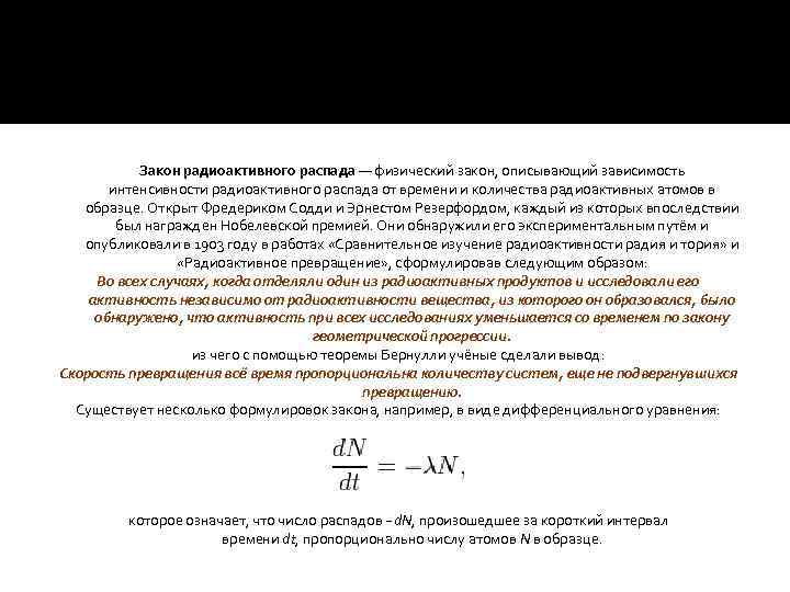 Закон радиоактивного распада — физический закон, описывающий зависимость интенсивности радиоактивного распада от времени и количества радиоактивных атомов в образце. Открыт Фредериком Содди и Эрнестом Резерфордом, каждый из которых впоследствии был награжден Нобелевской премией. Они обнаружили его экспериментальным путём и опубликовали в 1903 году в работах «Сравнительное изучение радиоактивности радия и тория» и «Радиоактивное превращение» , сформулировав следующим образом: Во всех случаях, когда отделяли один из радиоактивных продуктов и исследовали его активность независимо от радиоактивности вещества, из которого он образовался, было обнаружено, что активность при всех исследованиях уменьшается со временем по закону геометрической прогрессии. из чего с помощью теоремы Бернулли учёные сделали вывод: Скорость превращения всё время пропорциональна количеству систем, еще не подвергнувшихся превращению. Существует несколько формулировок закона, например, в виде дифференциального уравнения: которое означает, что число распадов −d. N, произошедшее за короткий интервал времени dt, пропорционально числу атомов N в образце.