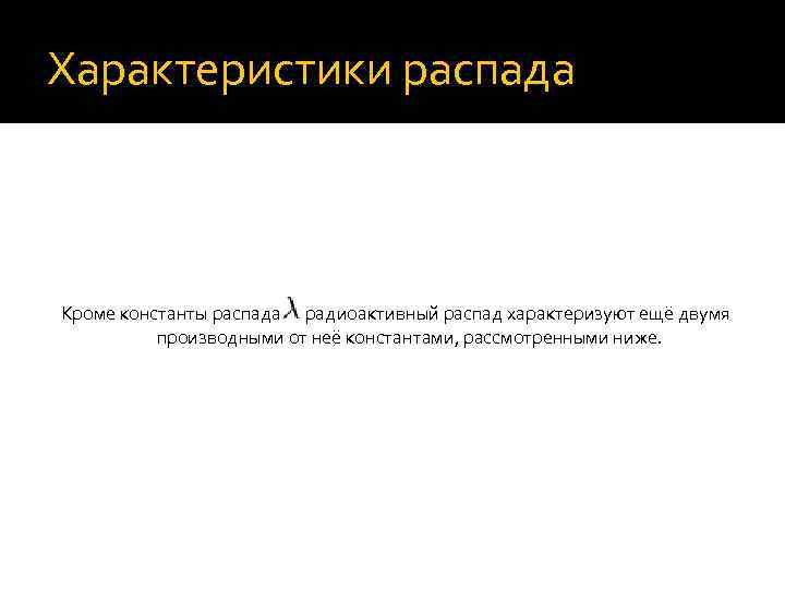 Характеристики распада Кроме константы распада радиоактивный распад характеризуют ещё двумя производными от неё константами, рассмотренными ниже.