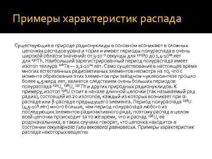 Примеры характеристик распада Существующие в природе радионуклиды в основном возникают в сложных цепочках распадов урана и тория и имеют периоды полураспада в очень широкой области значений: от 3· 10− 7 секунды для 212 Po до 1, 4· 1010 лет для 232 Th. Наибольший зарегистрированный период полураспада имеет изотоп теллура 128 Te — 2, 2· 1024 лет. Само существование в настоящее время многих естественных радиоактивных элементов несмотря на то, что с момента образования этих элементов при звёздном нуклеосинтезе прошло более 4, 5 млрд лет, является следствием очень больших периодов полураспада 235 U, 238 U, 232 Th и других природных радионуклидов. К примеру, изотоп 238 U стоит в начале длинной цепочки (так называемый ряд радия), состоящей из 20 изотопов, каждый из которых возникает при αраспаде или β-распаде предыдущего элемента. Период полураспада 238 U (4, 5· 109 лет) много больше, чем период полураспада любого из последующих элементов радиоактивного ряда, поэтому распад в целом всей цепочки происходит за то же время, что и распад 238 U, её родоначальника, в таких случаях говорят, что цепочка находится в состоянии секулярного (или векового) равновесия. Примеры характеристик распада некоторых веществ: