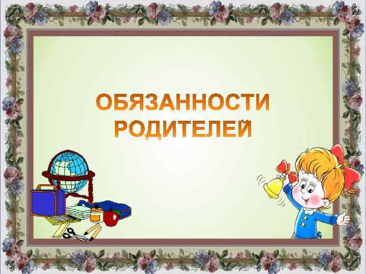 § Выполнять Устав школы в части, касающейся их прав и обязанностей; § Защищать права и интересы своих несовершеннолетних детей, не применять мер наказания, унижающих личность ребенка; § Воспитывать и создавать необходимые условия для получения детьми образования, направлять ребенка в школу в опрятном виде.