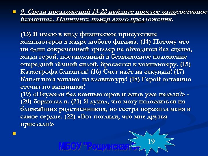 n n 9. Среди предложений 13 -22 найдите простое односоставное безличное. Напишите номер этого предложения. (13) Я имею в виду физическое присутствие компьютеров в кадре любого фильма. (14) Потому что ни один современный триллер не обходится без сцены, когда герой, поставленный в безвыходное положение очередной тёмной силой, бросается к компьютеру. (15) Катастрофа близится! (16) Счет идёт на секунды! (17) Капли пота капают на клавиатуру! (18) Герой отчаянно стучит по клавишам! (19) «Неужели без компьютеров и жить уже нельзя? » (20) бормотал я. (21) Я думал, что могу положиться на ближайших родственников, но сестра поразила меня в самое сердце. (22) «Вот погляди, что мне друзья прислали!» 19