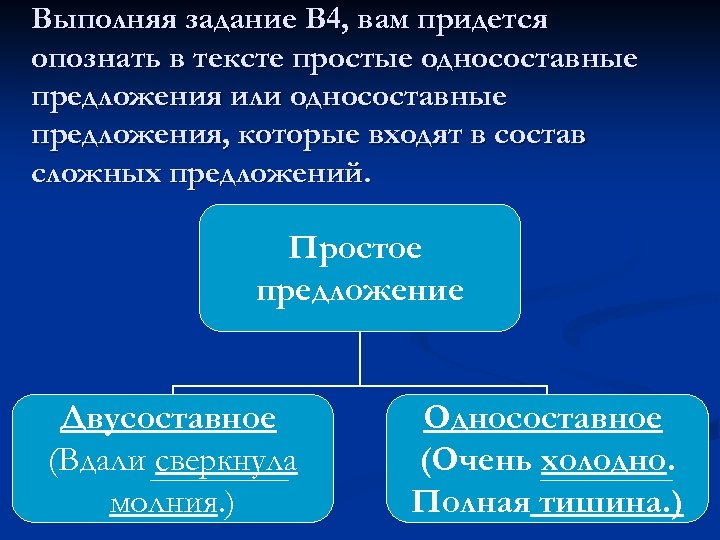 Выполняя задание В 4, вам придется опознать в тексте простые односоставные предложения или односоставные предложения, которые входят в состав сложных предложений. Простое предложение Двусоставное (Вдали сверкнула молния. ) Односоставное (Очень холодно. Полная тишина. )