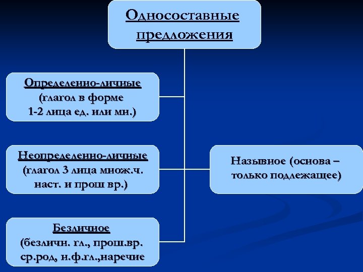 Односоставные предложения Определенно-личные (глагол в форме 1 -2 лица ед. или мн. ) Неопределенно-личные (глагол 3 лица множ. ч. наст. и прош вр. ) Безличное (безличн. гл. , прош. вр. ср. род, н. ф. гл. , наречие Назывное (основа – только подлежащее)