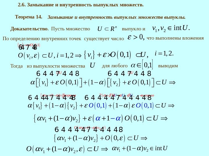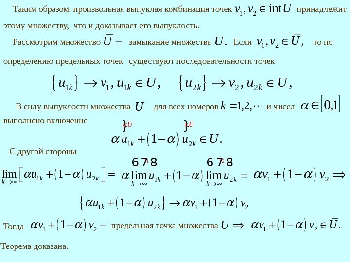 Теорема 14. Замыкание и внутренность выпуклых множеств выпуклы. Доказательство. Пусть множество n. RU выпукло и 1 2, int. v v U По определению внутренних точек 0, 1 , , 1, 2 i v O i. O v U i 64 7 48 1 20, 1 1 0, 1 U U v O U 6 4 4 7 4 4 8 Тогда Uиз выпуклости множества для любого 1, 0 выводим существует число 0, что выполнены вложения 0, 1 , iv O U 1, 2. i 2. 6. Замыкание и внутренность выпуклых множеств. 1 2(1 ) 1 0, 1 v v O U 1 2 (1 ) , O v v U 1 2(1 ) intv v U 1 2(1 1 2 ) , (1 ) 0, O v vv v O U 6 4 4 7 4 4 8 1 2(1 ) 7: 1 2 , 0, 1 01, 11 v v. Теорема UU U Uвыпукло Ov. Ov U