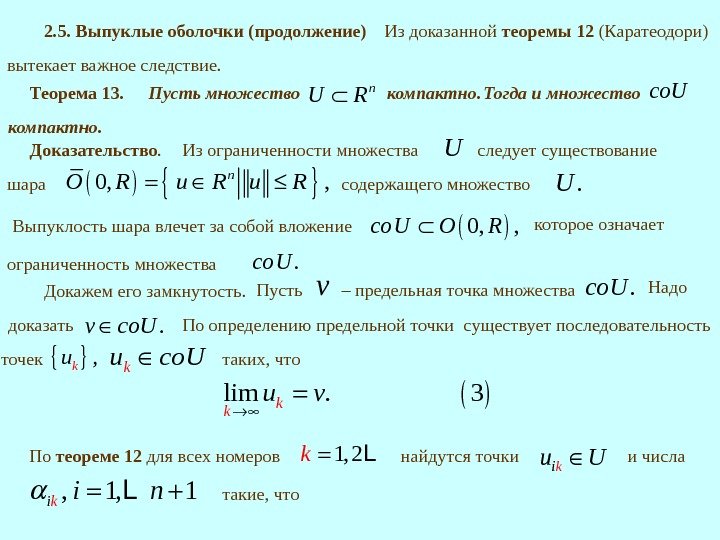 Теорема 13. Пусть множество n. U R компактно. Тогда и множество co. U компактно. Доказательство. Из ограниченности множества U следует существование шара 0, , n O R u R содержащего множество . U Выпуклость шара влечет за собой вложение 0, , co. U O R которое означает ограниченность множества . co. U 2. 5. Выпуклые оболочки (продолжение) Из доказанной теоремы 12 (Каратеодори) вытекает важное следствие. Докажем его замкнутость. Пусть v – предельная точка множества. co. U По определению предельной точки таких, что lim. 3 kk u v По теореме 12 для всех номеров 1, 2 k. L найдутся точки kiu U и числа , 1, 1 kii n L такие, что Надо. v co. U доказать , ku точек ku co. U существует последовательность