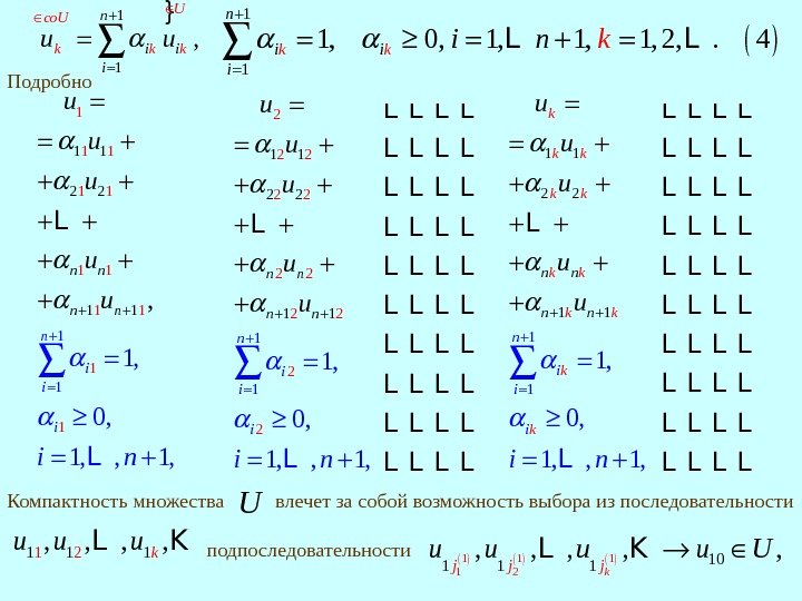 1 1 1 1 1 2 2 1 1 1 1, 0, 1, , 1 , , n i i i n n u u i n u L L 2 2 2 21 1 2 21 1 2 1, 0, 1, n i n n n i i n u u i u u u n L L L L L L L L L L L 1 1 2 1 1 1, 0, 1, k k k k n n n k k k i i i u u n u i L LПодробно Компактность множества U влечет за собой возможность выбора из последовательности 2111 1, , ku u u. L K подпоследовательности 1 1 2101 1 1 , , , kj j j u u U L K L L L L L L L L L L }1 1 , Uco. U k k n i ki iu u 1 1 1, 0, 1, 1, 1, 2, . 4 n i i k kiikn L L