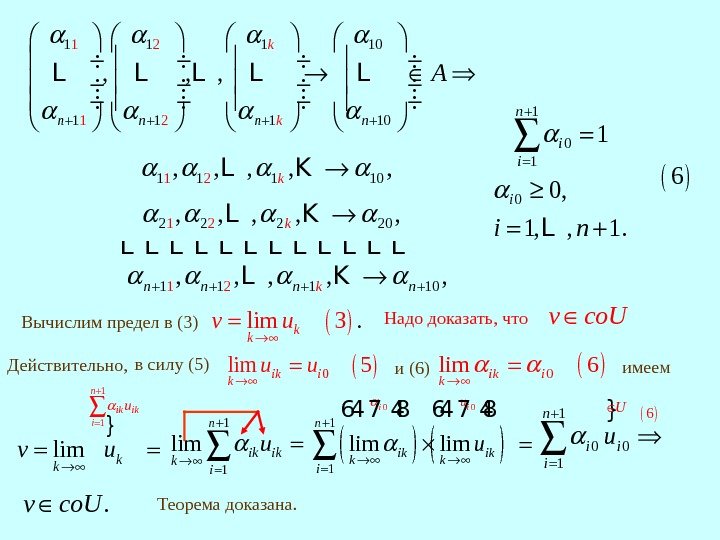 1 1 1 10 1 1 1 2 21 1 10 , , , k nkn n n A L L L 1 0 1 0, 1, , 1. n i i n L 1 1 lim n ik ik k i u } 1 1 lim n ik ik i k k u v u Вычислим предел в (3) lim. 3 k kv u Надо доказать, что v co. U 6 Действительно, в силу (5) 0 lim 5 ik i k u u и (6)0 lim 6 ik ik имеем. v co. U Теорема доказана. 0 0 1 1 limi i n ik ikk k u i u 64 7 48} 1 0 1 6 0 n i i i U u 1 1 10 2, , , k L K 2 212 202, , , k L K L L L 1 11 21 10, , , kn n L K