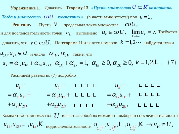 Упражнение 1. Теорему 13 «Пусть множество n U R компактно. Тогда и множество co. U компактно. » Доказать (в части замкнутости) при 1. n Решение. Пусть v – предельная точка множества , co. U и для последовательности точек ku выполнено , lim. k kk u co. U u v По теореме 11 для всех номеров 2, 1 k найдутся точки 1 2, k ku u U и числа 1 2, k k такие, что 1, 2, . 7 k. L 1 20, 0, k k 1 21, k k 1 1 2 2, k k ku u u Требуется доказать, что. v co. U Распишем равенство (7) подробно 1 1 1 21 1 2, u u u 2 2 1 22 1 2, u u u 1 1 2 2, k k k u u u L L LL L L Компактность множества U влечет за собой возможность выбора из последовательности 2111 1, , ku u u. L K подпоследовательности 1 1 2101 1 1 , , , kj j j u u U L K