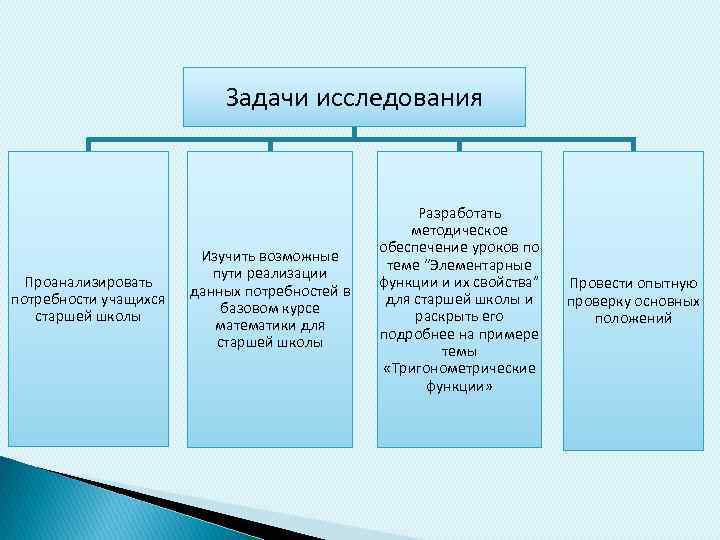 Задачи исследования Проанализировать потребности учащихся старшей школы Изучить возможные пути реализации данных потребностей в базовом курсе математики для старшей школы Разработать методическое обеспечение уроков по теме “Элементарные функции и их свойства” для старшей школы и раскрыть его подробнее на примере темы «Тригонометрические функции» Провести опытную проверку основных положений