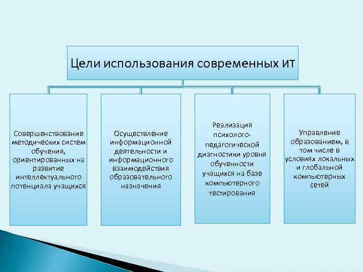 Цели использования современных ИТ Совершенствование методических систем обучения, ориентированных на развитие интеллектуального потенциала учащихся Осуществление информационной деятельности и информационного взаимодействия образовательного назначения Реализация психологопедагогической диагностики уровня обученности учащихся на базе компьютерного тестирования Управление образованием, в том числе в условиях локальных и глобальной компьютерных сетей