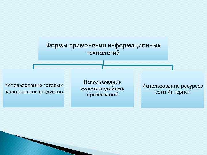 Формы применения информационных технологий Использование готовых электронных продуктов Использование мультимедийных презентаций Использование ресурсов сети Интернет