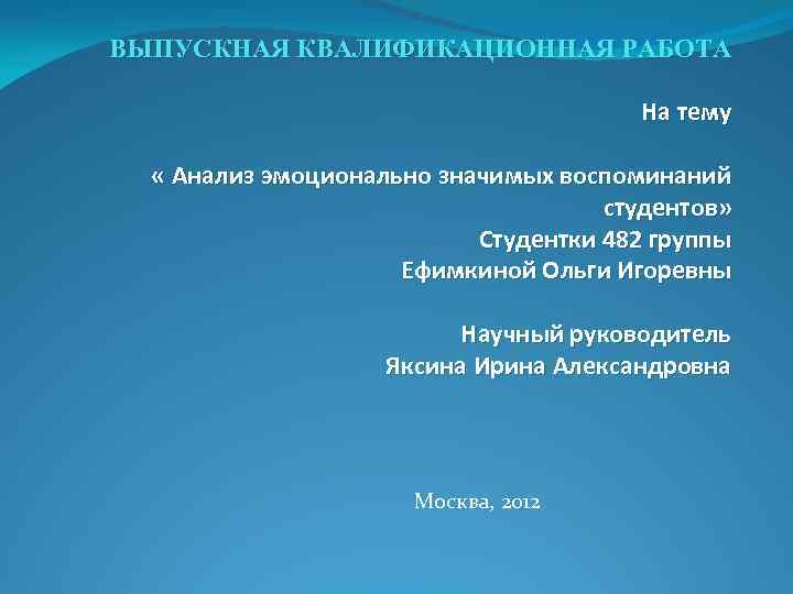 ВЫПУСКНАЯ КВАЛИФИКАЦИОННАЯ РАБОТА На тему « Анализ эмоционально значимых воспоминаний студентов» Студентки 482 группы Ефимкиной Ольги Игоревны Научный руководитель Яксина Ирина Александровна Москва, 2012