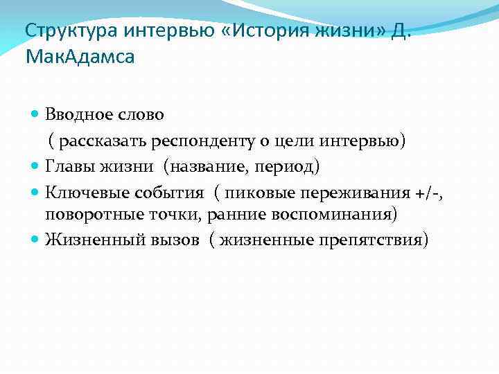 Структура интервью «История жизни» Д. Мак. Адамса Вводное слово ( рассказать респонденту о цели интервью) Главы жизни (название, период) Ключевые события ( пиковые переживания +/-, поворотные точки, ранние воспоминания) Жизненный вызов ( жизненные препятствия)