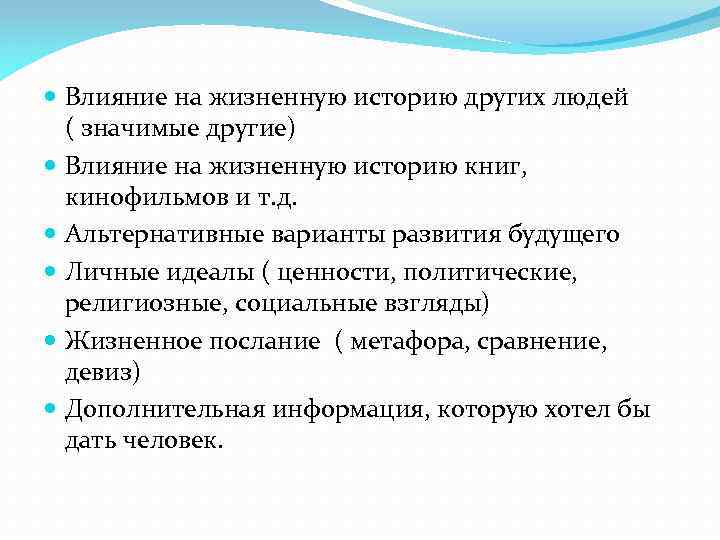 Влияние на жизненную историю других людей ( значимые другие) Влияние на жизненную историю книг, кинофильмов и т. д. Альтернативные варианты развития будущего Личные идеалы ( ценности, политические, религиозные, социальные взгляды) Жизненное послание ( метафора, сравнение, девиз) Дополнительная информация, которую хотел бы дать человек.