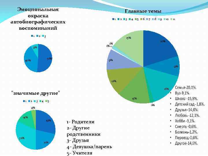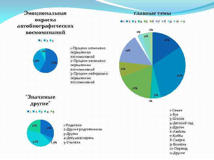 Эмоциональная окраска автобиографических восмоминаний 1 2 3 4 5 6 7 58% 8 9 10 11 2% 2% 4% 16% 3 7% 35% главные темы 1 -Процент позитивно окрашенных воспоминаний 2 -Процент негативно окрашенных воспоминаний 3 -Процент нейтрально окрашенных воспоминаний 14% 8% 30% 18% 5% "Значимые другие" 1 2 21% 42% 3 4 1% 5 32% 5% 1 -Родители 2 -Другие родственники 3 -Друзья 4 -Девушка/парень 5 -Учителя 1 -Семья 2 -Вуз 3 -Школа 4 -Детский сад 5 -Друзья 6 -Любовь 7 -Хобби 8 -Смерть 9 -Болезнь 10 -Переезд 11 -Другое