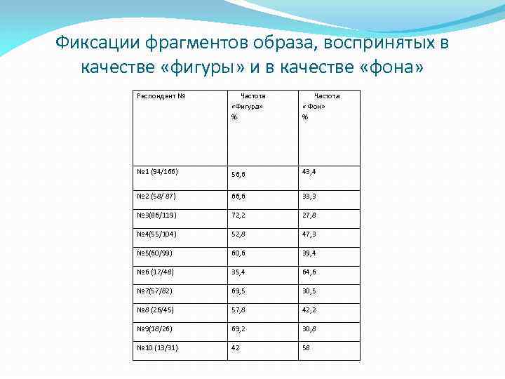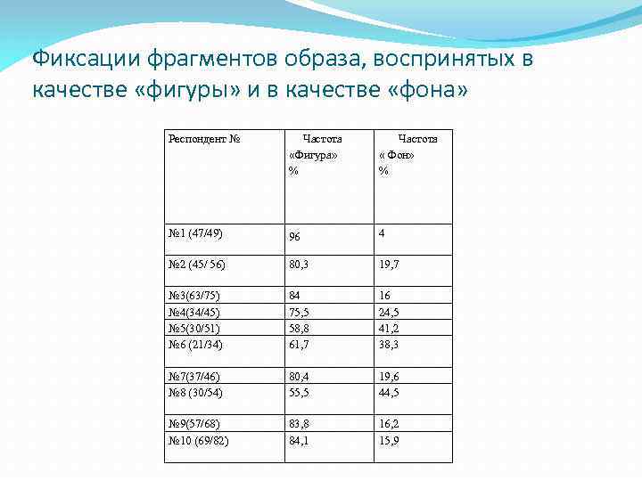Фиксации фрагментов образа, воспринятых в качестве «фигуры» и в качестве «фона» Респондент № Частота «Фигура» « Фон» % % № 1 (47/49) 96 4 № 2 (45/ 56) 80, 3 19, 7 № 3(63/75) № 4(34/45) № 5(30/51) № 6 (21/34) 84 75, 5 58, 8 61, 7 16 24, 5 41, 2 38, 3 № 7(37/46) № 8 (30/54) 80, 4 55, 5 19, 6 44, 5 № 9(57/68) № 10 (69/82) 83, 8 84, 1 16, 2 15, 9